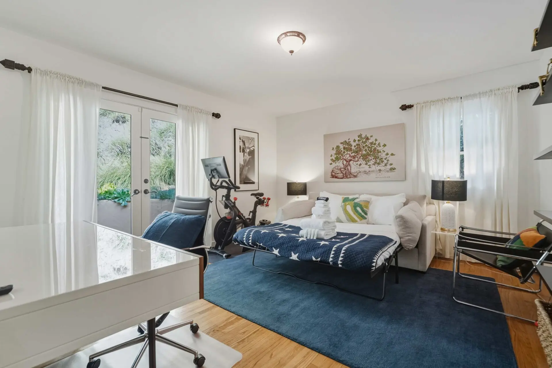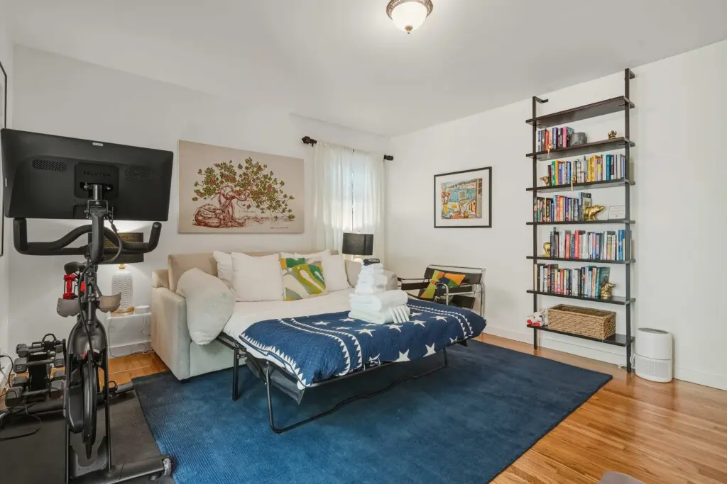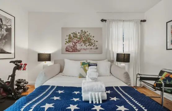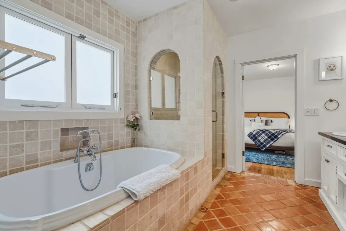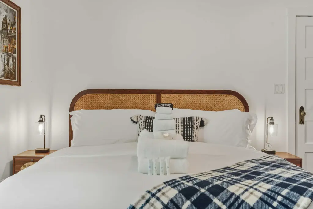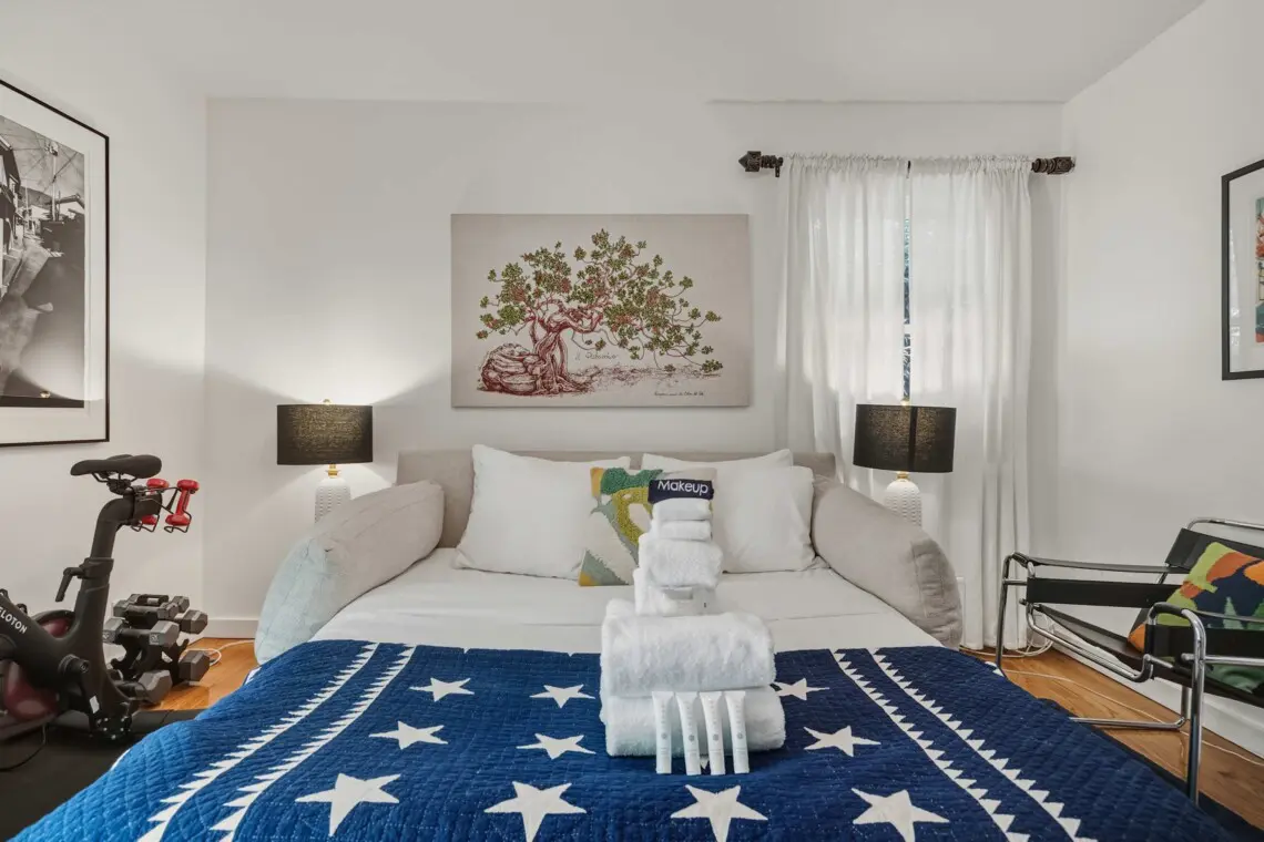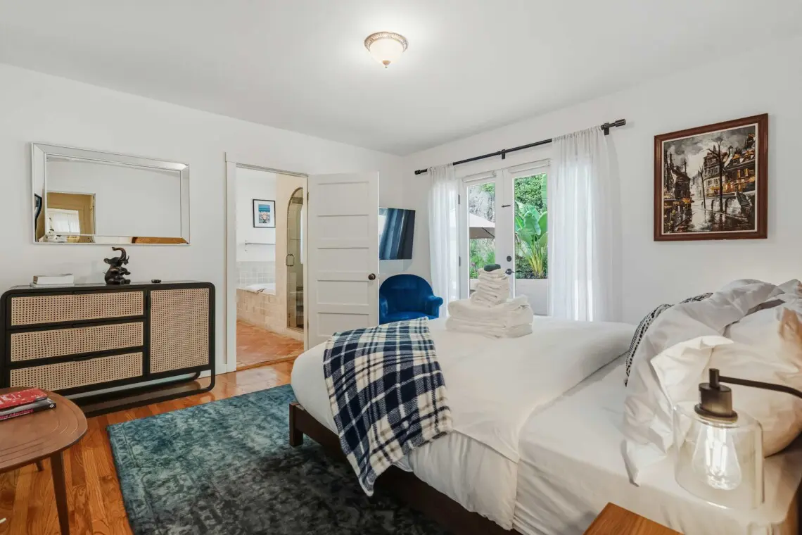 The home offers a flexible and comfortable sleeping arrangement designed to suit couples or friends. The primary bedroom features a luxurious king-size bed dressed in premium linens, while the living area includes a queen-size sleeper sofa for additional guests. A well-appointed bathroom with a bathtub, along with quality towels and travel amenities, ensures a relaxing and convenient stay.