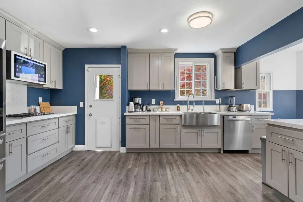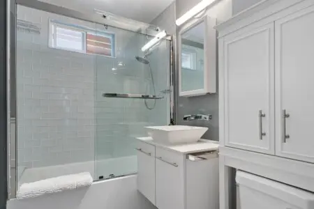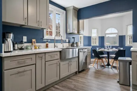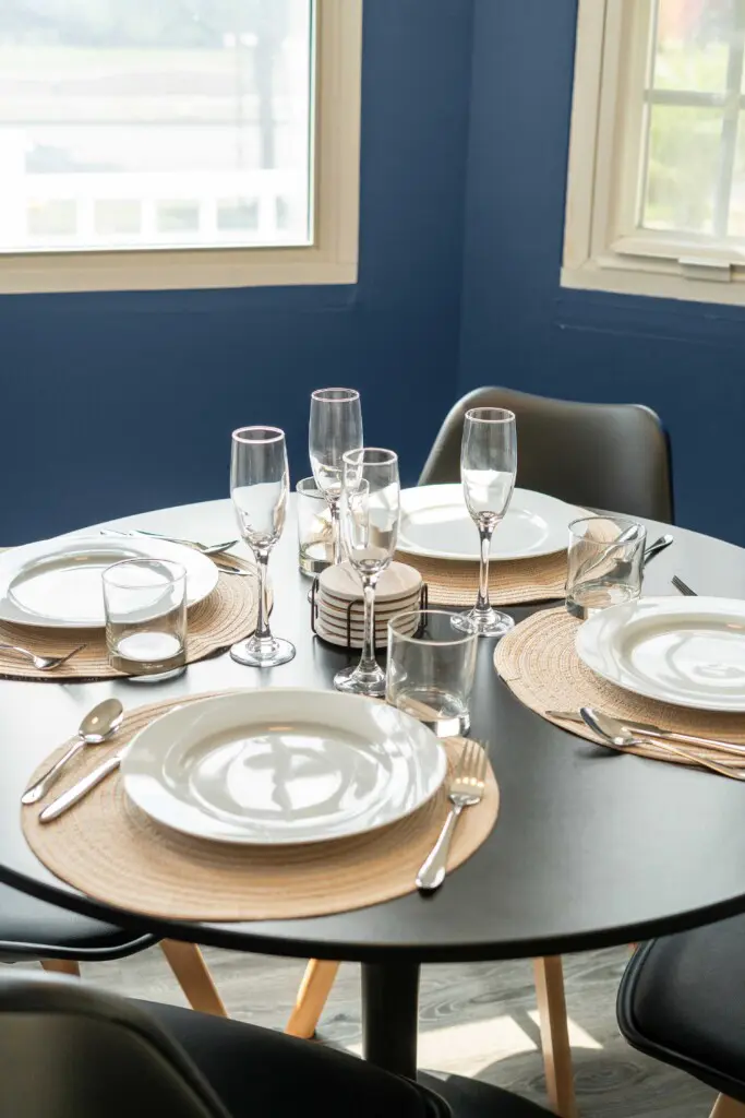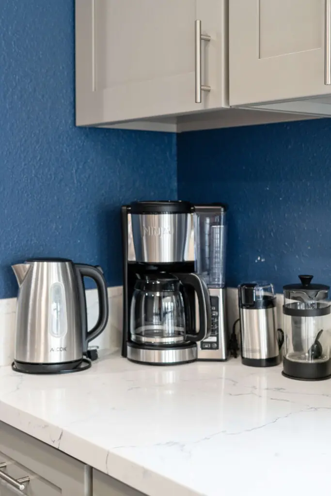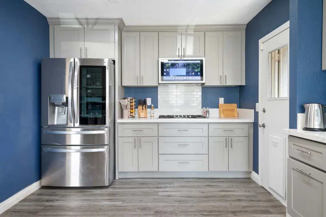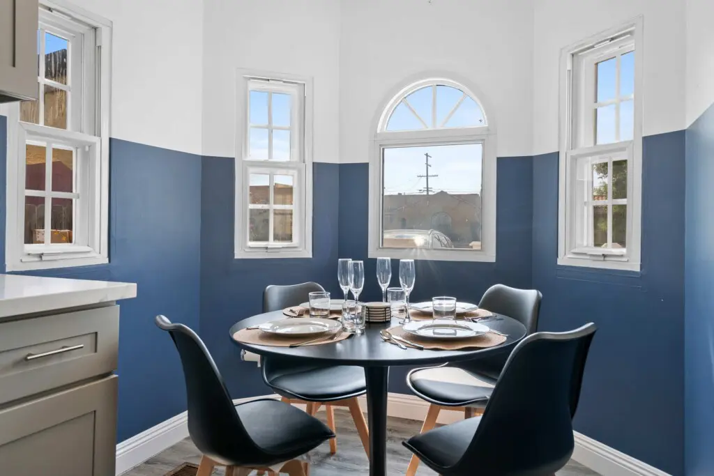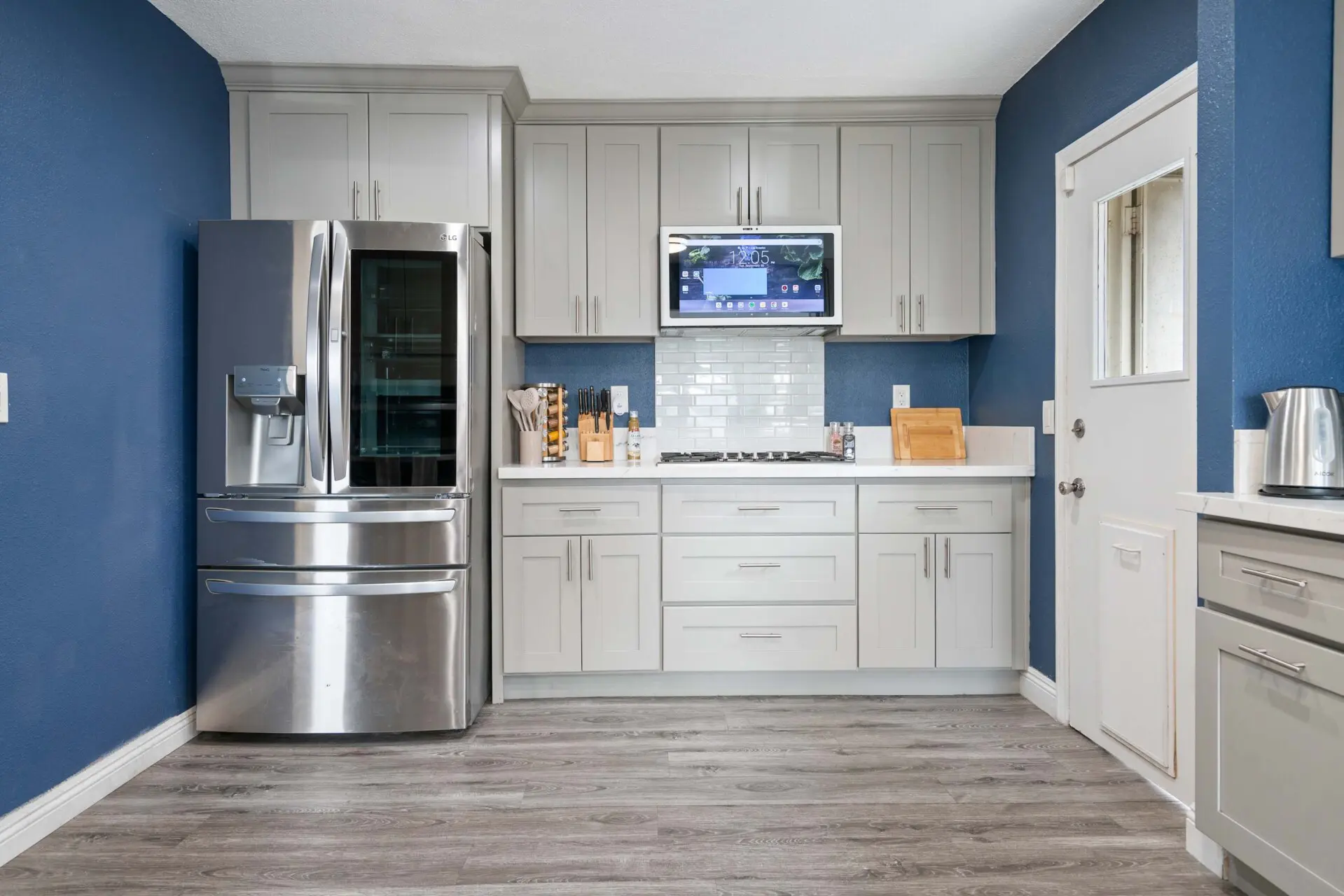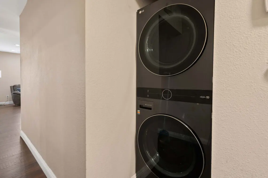 The fully equipped kitchen is both functional and stylish, featuring stainless steel appliances, generous counter space, and everything needed to prepare meals with ease. Whether you’re cooking at home, grabbing local takeout, or enjoying a relaxed breakfast before heading out, the kitchen supports effortless everyday living.