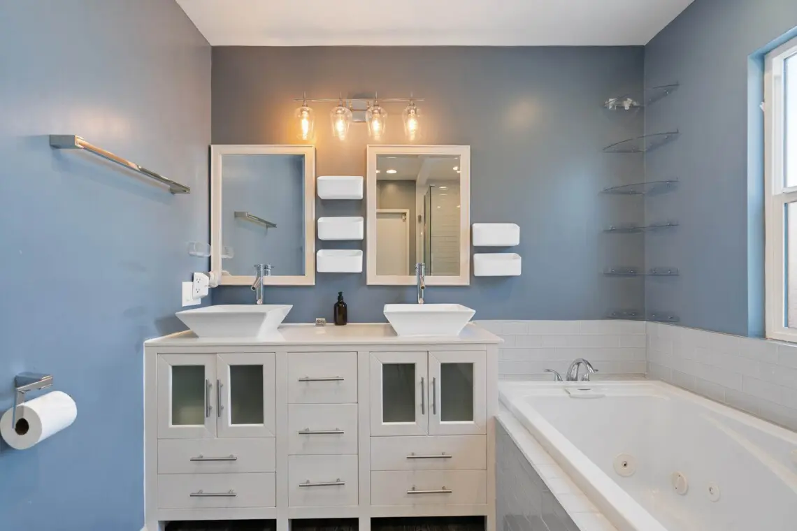 Three comfortable bedrooms provide flexible sleeping arrangements with one king bed, one queen bed, and one full bed—perfect for families, groups, or traveling professionals. Each bedroom is designed for rest and relaxation, featuring premium linens, cohesive décor, and central air and heat to ensure year-round comfort. Two full bathrooms are stocked with essential travel amenities such as soaps, shampoo, and conditioner for a convenient, hotel-style experience.